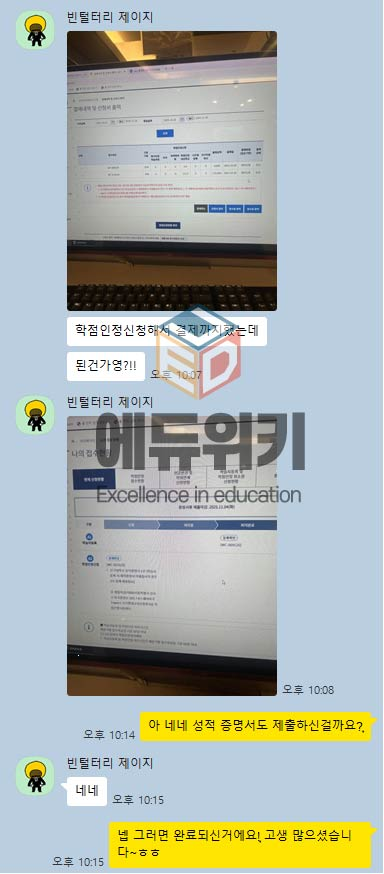 - 전적대 성적을 120학점을 가져올 수 있어 한 학기만에 학사학위 취득이 가능했습니다.