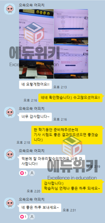 직장 병행 및 기사 필/실기 공부로 인해 시간적 여유가 없어 수료에 대한 고민도 많으셨는데 학기 중에 큰 부담없이 수료하실 수 있도록 과제 및 시험 관련 자료를 통해 도움을 드렸고 재수강 없이 기간내 무사히 수료하셨습니다:)