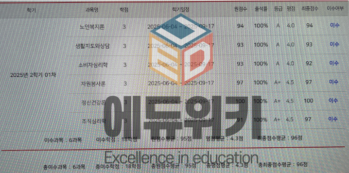 직장을 다니시면서 학력개선이 필요해 학점은행제를 통해 경영학사를 취득한 김ㅇㅇ 학습자님입니다. 최종학력이 고졸이기 때문에 총 4학기 과정으로 안내 도와드렸고, 마지막 학기인 25년도 2학기 성적을 평균 4.3이라는 높은 성적으로 마무리 하셨습니다.