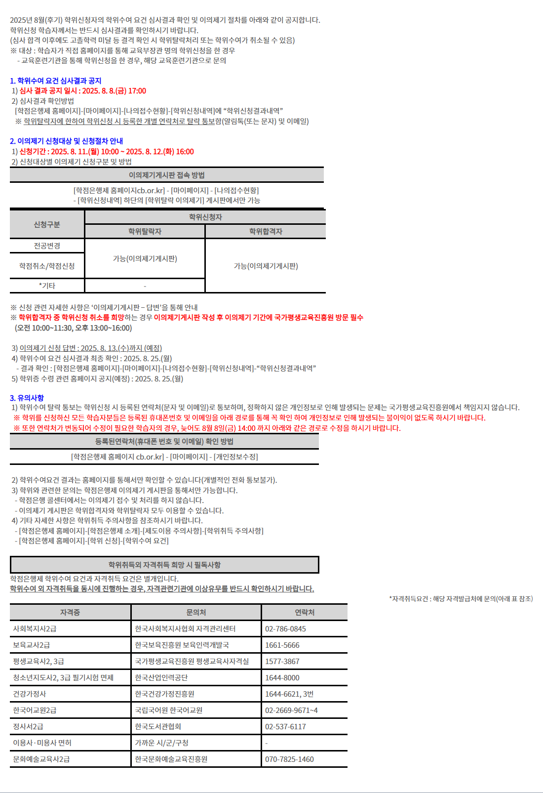2025년 8월(후기) 학위신청자 학위수여 요건 심사결과 확인 및 이의제기 절차 안내