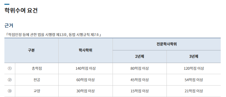 2) 학사학위: 전공 60학점 이상 + 교양 30학점 이상 = 총 140학점