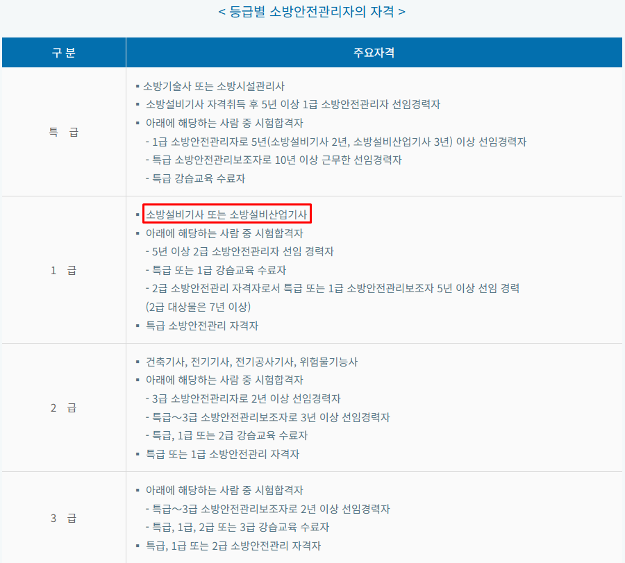 오늘은 소방안전관리자 등급별 선임기준을