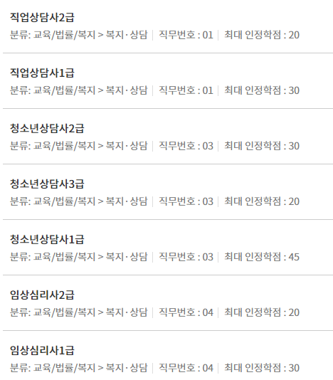 청소년상담사나 임상심리사는 응시자격이 제한되어 있어 대부분 직업상담사2급 자격증을 취득하고 있습니다.